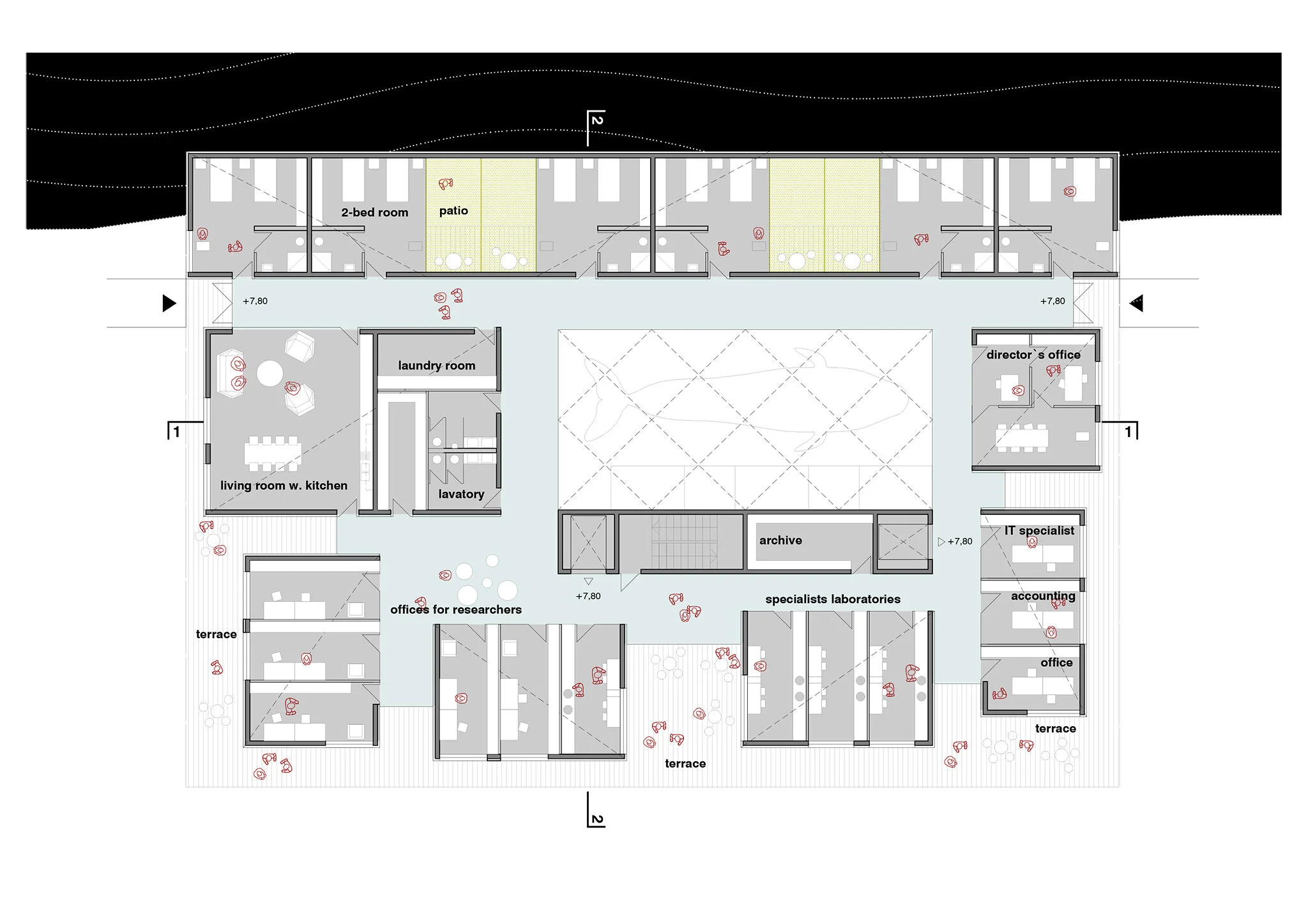 MSM is a museum for science and research by Blue World Institute, located on an abandoned military site on the edge of Mali Lošinj. The existing site topography is used to organize the program over three floors, each of them with direct access from the ground. The spaces are organized around a central three-story "void" that contains large museum exhibits of the underwater world, visually connects all the areas and provides a fluid and flexible use of space.